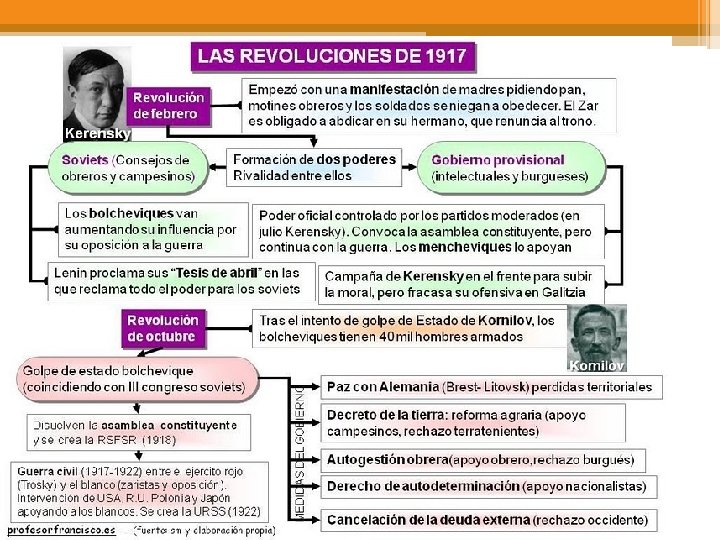 REVOLUCIÓ DE FEBRER -Primera Guerra Mundial → condicions esclat revolució - no preparats per una guerra llarga i dura - desastres militars (batalla Tannenberg) - pagesos a la guerra → descens producció agrícola - fam a les ciutats - malestar obrers i pagesos Organització de la població en SOVIETS - pressionen per retirar-se de la guerra i fi tsar Oposició política: - burgesos (liberal i kadet) - pagesos (socialrevolucionaris) - obrers (menxevics i bolxevics) FEBRER 1917 -Manifestació a Sant Petersburg: PAU I PA - Vaga general i motins en les casernes militars. Exèrcit es nega a reprimir vaguistes. - constitució govern provisional Kerenski. - 3 març. Abdicació del tsar Nicolau II → República Democràtica (govern provisional) LENIN: líders dels bolxevics. Al febrer estava a l’exili. Torna a la primavera “tot el poder per als soviets”