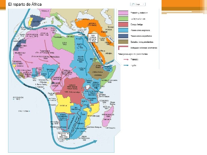 IMPERI FRANCÈS -2 n gran imperi - extensió. - Àfrica: - projecte Oest – Est. Incident Fashoda - Argèlia, Tuníssia, Marroc, Senegal, Txad, Guinea, Costa d’Ivori, i Benin; Marroc, part del Congo i illa de Madagascar. └ conflicte amb Alemanya (preludi I GM) -Àsia: - Indoxin: part de Birmània, Laos, Cambodja, Vietnam, Tailandia, Malàsia. - tractats favorables amb Xina - Oceania: - Nova Caledonia - Amèrica: - Illes del Pacífic: Tahití, Illes Marqueses - costes Canadà: arxipèlag Miqueló - sud: Guaiana