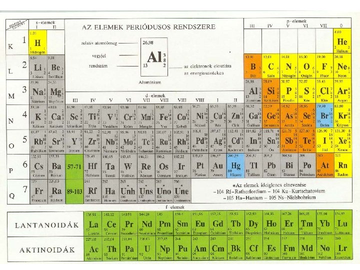 A KVANTUMSZÁMOK Kvantumszám „Jelentése” Értékei n: főkvantumszám körpálya sorszáma n 1, 2, 3, 4, . . . l: mellékkvantumszám ellipszispályák száma l 0, 1, 2, 3, . . . , n– 1 m: mágneses kvantumszám pályasík térbeli helyzete m –l, . . . – 1, 0, 1, 2, . . . , l s: spinkvantumszám forgás iránya s 1/2 ; -1/2 Tehát egy adott n főkvantumszámú héjon legfeljebb 2 n 2 elektron tartózkodhat.