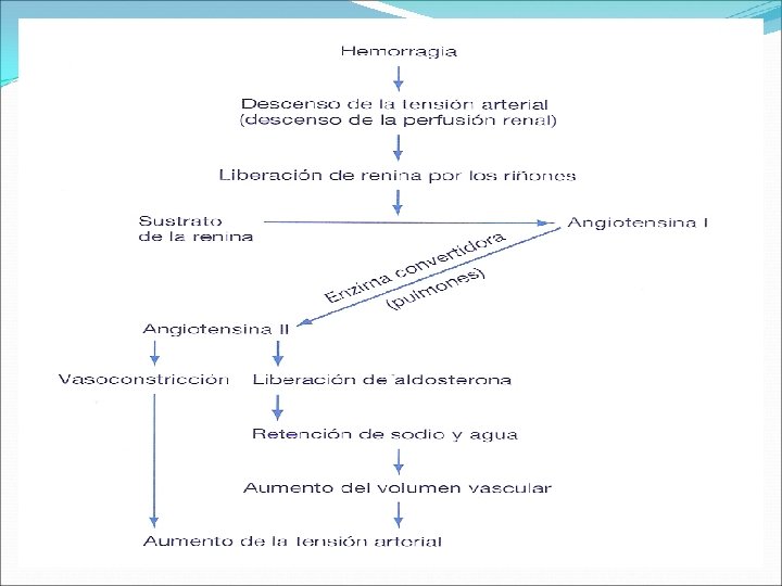 Regulación de la Volemia CAMBIOS EN EL VEC Barorreceptores y Receptores de estiramiento Br. Intravasculares Alta presión Dependientes del glosofaríngeo y neumogástrico Carótidas y Cayado aórtico Reflejo miogénico Estrés de rozamiento Lecho vascular Síntesis y Liberación de ON Aumento del Volumen Quimiorreceptores intracraneales ØPresión en el Sinusoide hepático Superficie del III ventrículo ØActividad aferente del neumogástrico Aumento de Presión transmural Modula y evita el exceso Distensión Natriuresis Mecanorreceptores intrahepáticos Síntesis de endotelina Vasoconstricción INTEGRACIÓN Hipotálamo ØActividad eferente hacia riñón Sensibles a la tonicidad plasmática Y del LCR