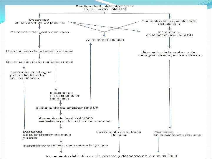 Mecanismo de la Sed Estímulos de la sed: Activadores: Deshidratación intracelular. Hipernatremia. Angiotensina II. Hipovolemia. Bajo gasto. Sequedad de la Boca. Inhibidores: Hiponatremia. Edema Celular Humidificación/enfriamient o de la boca. Distensión gástrica.