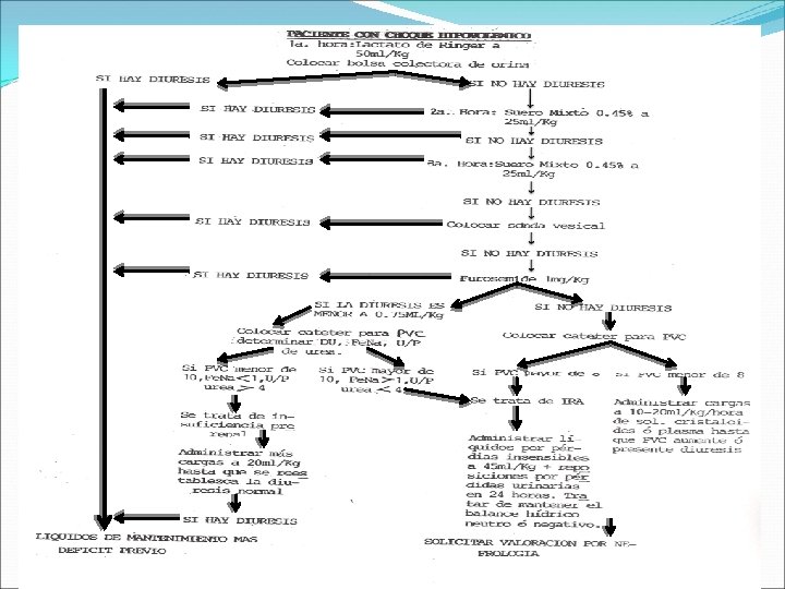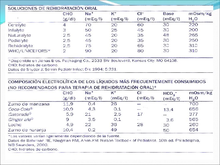 Indicaciones de líquidos parenterales 1. Signos de choque hipovolemico. 2. Alteraciones en estado de conciencia 3. Distensión abdominal: por ileo, sospecha de abdomen agudo 4. Complicaciones relacionadas con la diarrea: sepsis 5. Vómitos incoercibles PERSISTENTES: mas de cuatro vómitos en el termino de una hora 6. Gasto fecal alto: mas de una evacuación/hora o mayor de 5 -10 g/kg/hora 7. Fracaso del tratamiento de rehidratación oral.