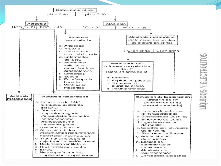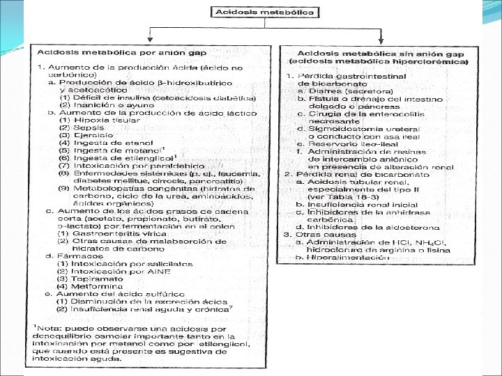 III. Trastorno Acido Básico • Acidosis metabólica. • Alcalosis metabólica. Reglas para determinar los trastornos acido-base primarios 1. Determinar el p. H: el organismo no corrige totalmente los trastornos acido-base primarios; por lo tanto, la principal alteración va a desplazar el p. H lejos del valor de 7. 40. Examinar la Pco 2 y el HCO 3 para determinar si la principal causa es una acidosis/alcalosis metabólica o respiratoria. 2. Calcular anión gap: Si el anión gap es ≥ 20 mmol/l, se trata de una acidosis metabólica primaria, independientemente del valor del p. H o de la concentración sérica de bicarbonato. ( el Organismo no produce una gran cantidad de anión gap que compense un trastorno primario. ) Anion gap = (Na + K) - (Cl + [HCO 3 -]) 3. Calcular el exceso de anion gap ( esto es, << ∆Gap>>, << ∆ Gap-Gap>> ∆Gap= [anion gap calculado – anion gap normal (o sea, 12) mmol/l] + HCO 3 medio