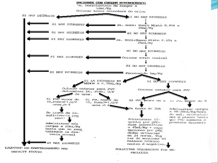 Indicaciones de líquidos parenterales 1. Signos de choque hipovolemico. 2. Alteraciones en estado de conciencia 3. Distensión abdominal: por ileo, sospecha de abdomen agudo 4. Complicaciones relacionadas con la diarrea: sepsis 5. Vómitos incoercibles PERSISTENTES: mas de cuatro vómitos en el termino de una hora 6. Gasto fecal alto: mas de una evacuación/hora o mayor de 5 -10 g/kg/hora 7. Fracaso del tratamiento de rehidratación oral.