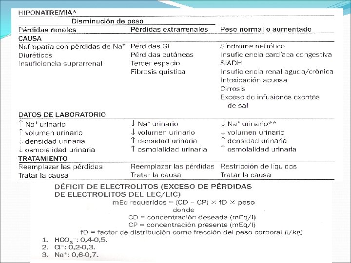 I. Alteración osmolar Por medio de la determinación de sodio: • DHE Isotónica (Isonatremia): 80% • DHE Hipertónica (Hipernatremia): 15% • DHE hipotónica (Hiponatremia): 5% 130 -150 m. Eq/lt mas de 150 m. Eq/lt Menos de 130 m. Eq/lt Hiponatremia sintomática La corrección del déficit no debe exceder de 50 ml/Kg por 24 hora Corrección del déficit debe hacerse en 48 horas con una concentración de sodio a 30 -50 m. Eq/lt