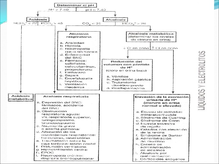 III. Trastorno Acido Básico • Acidosis metabólica. • Alcalosis metabólica. Reglas para determinar los trastornos acido-base primarios 1. Determinar el p. H: el organismo no corrige totalmente los trastornos acido-base primarios; por lo tanto, la principal alteración va a desplazar el p. H lejos del valor de 7. 40. Examinar la Pco 2 y el HCO 3 para determinar si la principal causa es una acidosis/alcalosis metabólica o respiratoria. 2. Calcular anión gap: Si el anión gap es ≥ 20 mmol/l, se trata de una acidosis metabólica primaria, independientemente del valor del p. H o de la concentración sérica de bicarbonato. ( el Organismo no produce una gran cantidad de anión gap que compense un trastorno primario. ) Anion gap = (Na + K) - (Cl + [HCO 3 -]) 3. Calcular el exceso de anion gap ( esto es, << ∆Gap>>, << ∆ Gap-Gap>> ∆Gap= [anion gap calculado – anion gap normal (o sea, 12) mmol/l] + HCO 3 medio