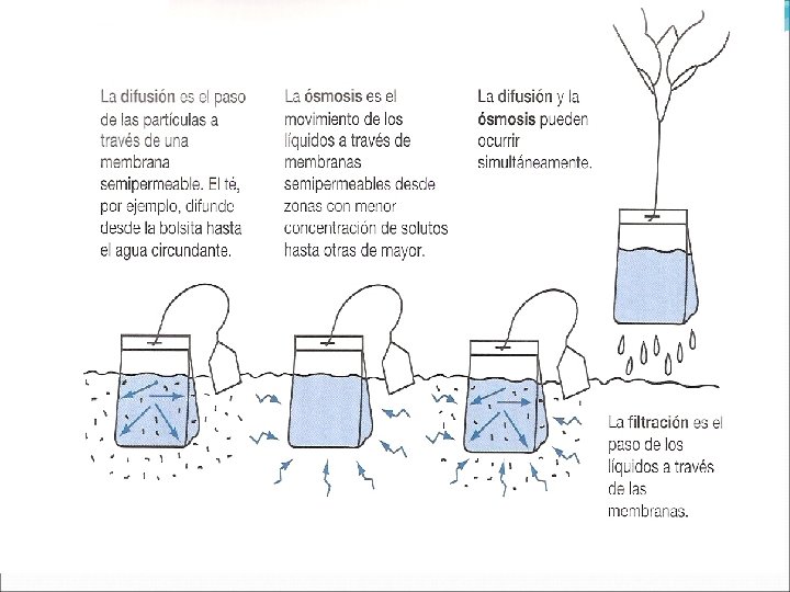 Factores que afectan el movimiento del agua y sus solutos 1. a) b) c) Membranas Celulares: separan el LIC del L intersticial y están compuestas por lípidos y proteína Capilares: separan el LIV del L Epiteliales: separan el LI y el LIV del LTC. 2. Procesos de Transporte a. Difusión: Movimiento aleatorio de las partículas en cualquier dirección en el seno de una solución o un gas. Las partículas se desplazan desde un área de alta concentración hacia una de baja a lo largo de un gradiente de concentración. b. - Transporte activo: para que una sustancia se mueva desde un área de igual o menor concentración a una área de igual o mayor concentración, se requiere energía. c. - Filtración: Movimiento del agua y los solutos desde un área de alta presión hidrostática hasta un área de baja presión hidrostática. d. - Osmosis: es el movimiento del agua a través de una membrana semipermeable desde un área de baja concentración de solutos hasta un área de mayor concentración de solutos. e. -Cotransporte