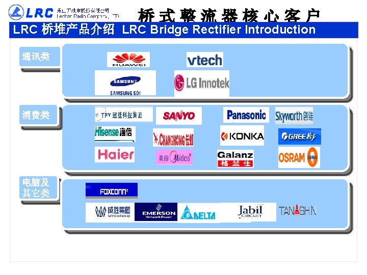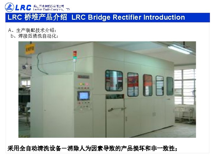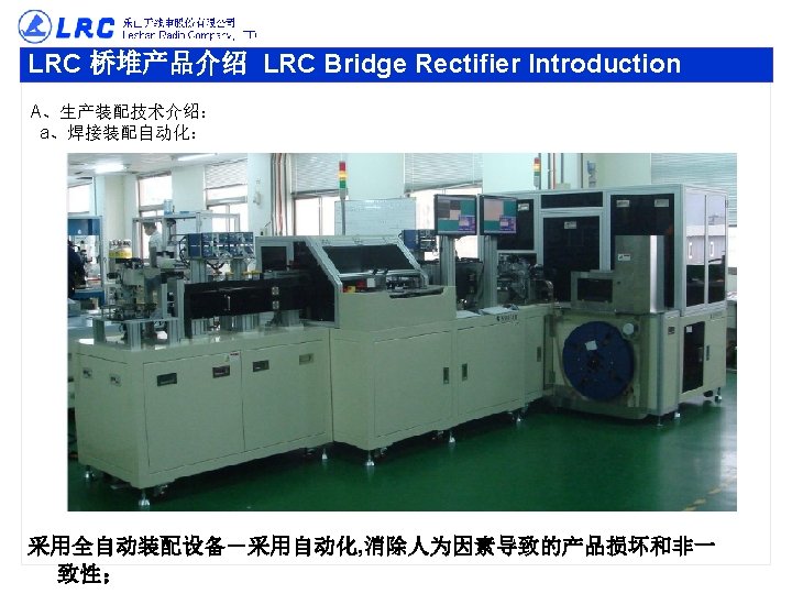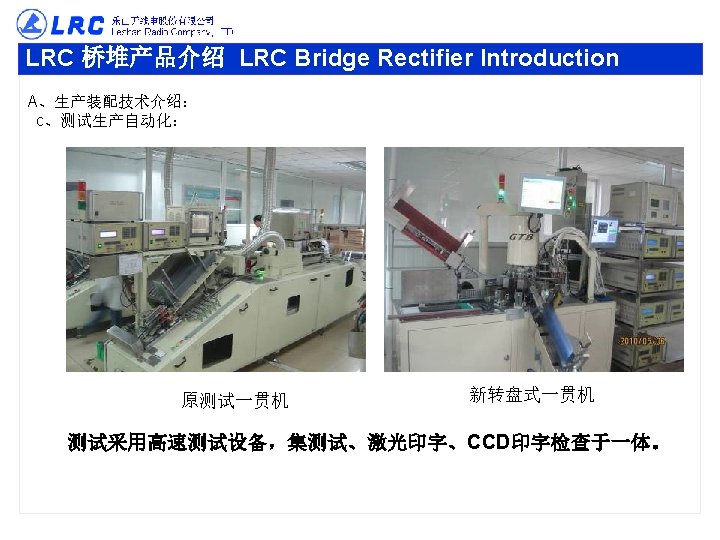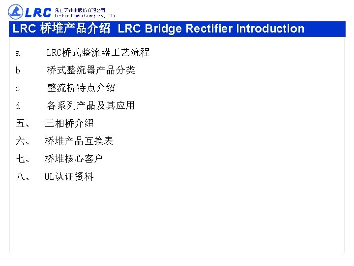 LRC 桥堆产品介绍 LRC Bridge Rectifier Introduction Plastic Sealed 塑封生产线 Diode Plant Glass Sealed 玻封生产线 Diode Plant Bridge Plan 桥生产线 SMD Plant 贴片生产线 We are Here! 公司办公大楼