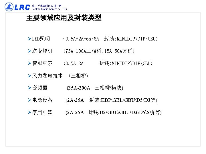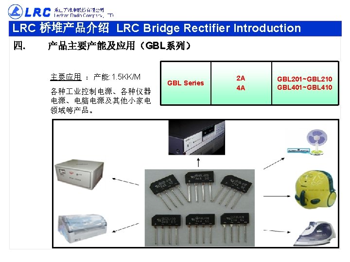 LRC 桥堆产品介绍 LRC Bridge Rectifier Introduction 四. 产品主要产能及应用(GBU系列) 主要应用 :产能: 3. 5 KK/M 各种 业控制电源、各种仪器 电源、计算机电源及显视器和 TV等产品。 GBU Series 4 A 6 A 8 A 10 A 15 A 20 A 25 A GBU 4 A~GBU 4 M GBU 6 A~GBU 6 M GBU 8 A~GBU 8 M GBU 10 A~GBU 10 M GBU 15 A~GBU 15 M GBU 20 A-25 M GBU 25 A-25 M
