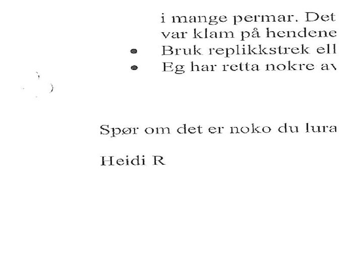Leseinstruks til lærer • Dette synes jeg at jeg fikk til… • Dette jobbet jeg med å få til…. . • Dette synes jeg var spesielt vanskelig • Kan du se spesielt på… • Spørsmål til læreren…. . Å komme elevperspektivet i møte!