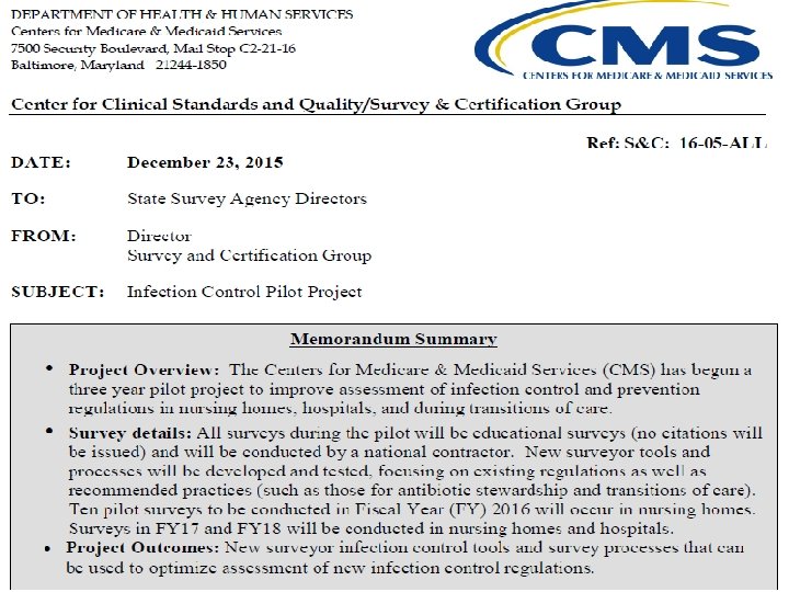 Pilot Project Snapshot 10 in ‘ 16 Educational ‘ 17 & ‘ 18 • National contractor • Existing regulations • Recommended practices • New survey tools • NHSN • LTC & acute care • HAI control • Education