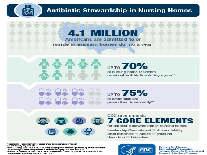 Antibiotic Stewardship • Antibiotic stewardship refers to a set of commitments and activities designed to “optimize the treatment of infections while reducing the adverse events associated with antibiotic use. ” CDC core elements of antibiotic stewardship for nursing homes