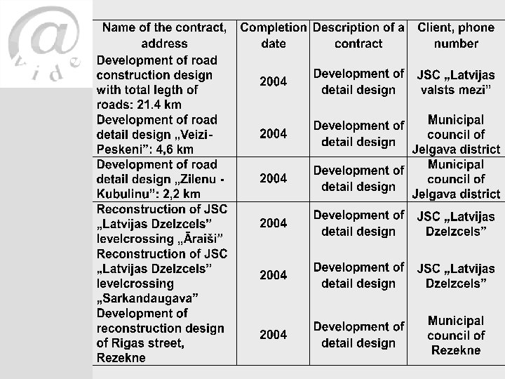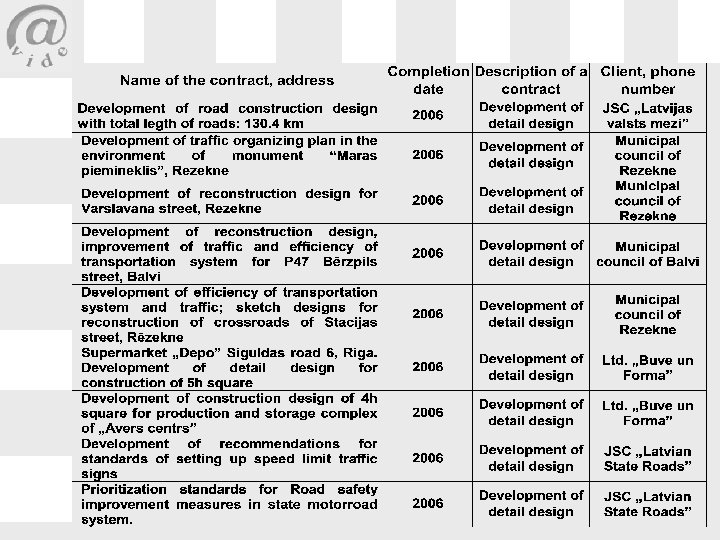 There are 18 employees in the company, including civil engineers, programmers, experts of telecommunications, water supply and drainage design. The computerized medium Auto. CAD, which is being used for designing estimates and graphical support, enables to create a flexible, operative correction mechanism. All the employees have mastered the principles and methods of computerized designing. Employees of the company have certificates of building practice and professional conformity in a matter of development of lines of communication. Ltd. “A vide” also performs geotechnical trial works in the whole national territory – both in supervision of autoroads, streets etc. and in consulting questions related with road design.