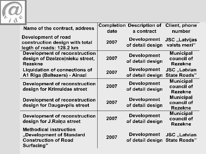 Ltd. “A vide” is a private design company that was founded in 2001. Company has rights to perform the following: • architectural planning; • water supply and drainage design; • design of telecommunication systems and networks; • road design, realization and supervision of constructive works.