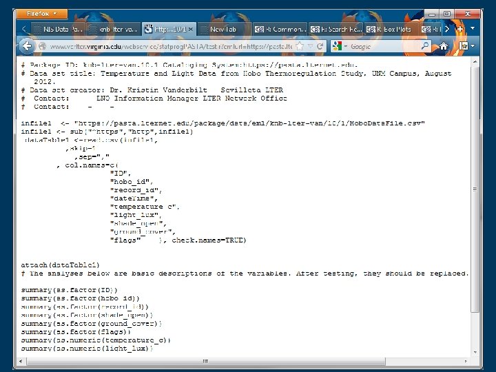 Web Service Using PASTA & R The web service address is: http: //vcr. lternet. edu/webservice/PASTAprog/ Follow it with the ID of the dataset, followed by an. r for example: knb-lter-van. 10. 4. r http: //vcr. lternet. edu/webservice/PASTAprog/knb-lter-van. 10. 4. r