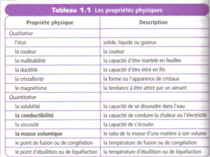 Les propriétés physiques sont classifiées en deux catégories: Les propriétés physiques : Quantitative →Quantité l’or a une densité de 19, 3 g/cm 3 à 20°C l’or a un point de fusion de 1062 °C etc. *Qui peut être mesuré. Qualitative → Qualité L’or a un couleur jaunâtre luisante À la température de la pièce, l’or est solide Etc. *Qui ne peut pas être mesuré mais plutôt observé.