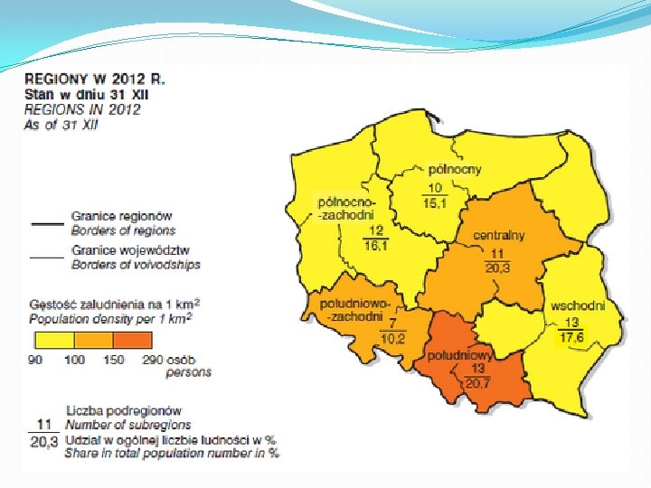 Gęstość zaludnienia �średnia gęstość zaludnienia to 123 osoby / km 2 (30 osób / km 2 - USA) �w miastach mieszka 61 % ludności �najwięcej Polaków mieszka w południowej części Polski, a najmniej na północy Polski