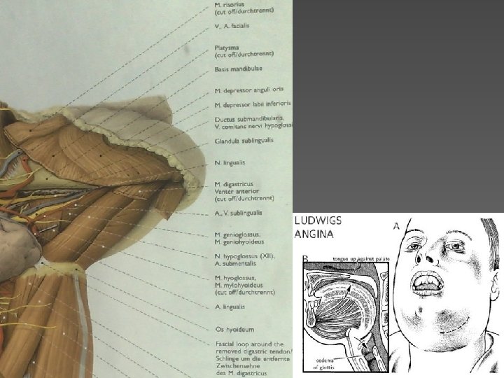 M. mylohyoideus jaotab submandibulaarse ruumi kaheks: ülalpool sublingvaalseks, allpool submaksillaarseks. � Infektsioonilevik on eespool piiratud mandibula poolt. � Infektsioon levib üles- ja tahapoole, tõstes keelt. � Keeleluu takistab infektsiooni levikut allapoole ja turse levib kaelal ettepoole, põhjustades „härjakaela“. �