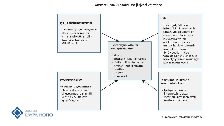 Luentomateriaalin käyttö • • Käypä hoito -suositusten luentomateriaalit on laadittu tukemaan suosituksen käyttöönottoa. Ne ovat vapaasti käytettävissä terveydenhuollon, julkishallinnon ja oppilaitosten koulutuksissa ja apuna ammattilaisten arjessa. Käyvän hoidon tuottamat aineistot ovat kaikille avoimia ja maksuttomia. Esityksen sisältöä ei saa muuttaa. – Jos esitykseen sisällytetään muuta materiaalia, Käypä hoito -esityspohjaa ei saa käyttää lisätyssä materiaalissa.