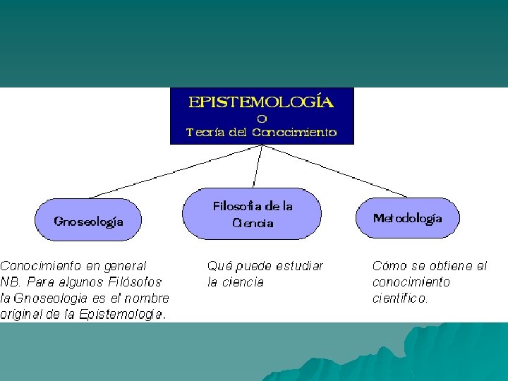El concepto Epistemología (del griego, episteme, 'conocimiento'; logos, 'teoría'), rama de la filosofía que trata de los problemas filosóficos que rodean la teoría del conocimiento. u La epistemología se ocupa de: u – la definición del saber y de los conceptos relacionados, de las fuentes, los criterios, – los tipos de conocimiento posible y el grado con el que cada uno resulta cierto; – así como la relación exacta entre el que conoce y el objeto conocido.