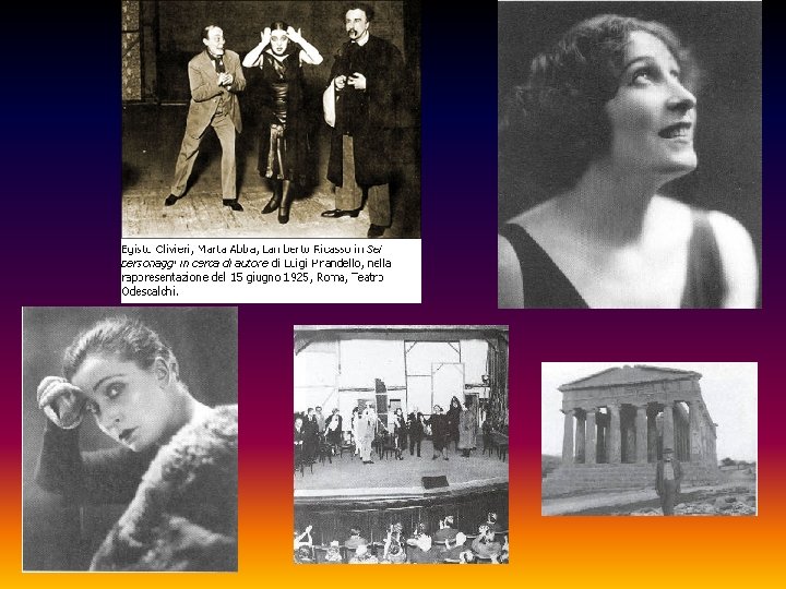 Il teatro umoristico e il successo internazionale (1916 -1925) Guerra Stefano prigioniero Morte madre Casa di cura per Antonietta 1917: Il berretto a sonagli 1918: Così è (se vi pare) 1918: Il giuoco delle parti 1921: Sei personaggi in cerca di autore (Roma e Milano) 1923: abbandono insegnamento 1923: Enrico IV Tournèes in Argentina e Brasile 1924: iscrizione al partito fascista La direzione del Teatro d’Arte La relazione con Marta Abba