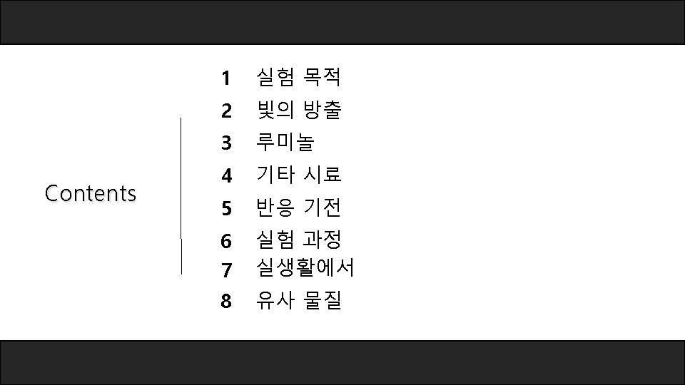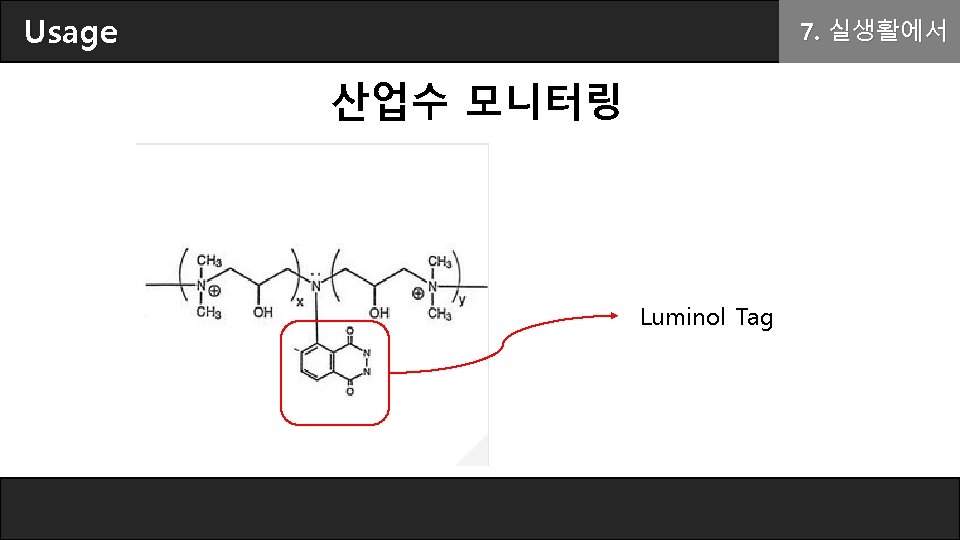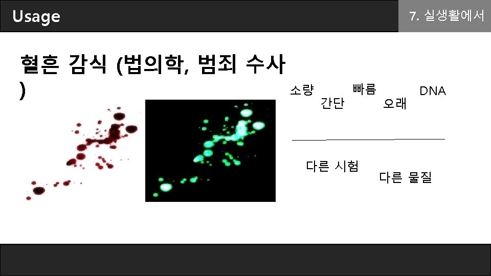 Chemiluminescence(화학발광) A + hv → A* → 2. 빛의 방출 A + hv [Photo. ] A + B → C* → products + hv [Chemi. ] A + B → C* │ C*+dye → C+dye* │ dye hv [Chemi. ] Luminol exhibits chemiluminescence