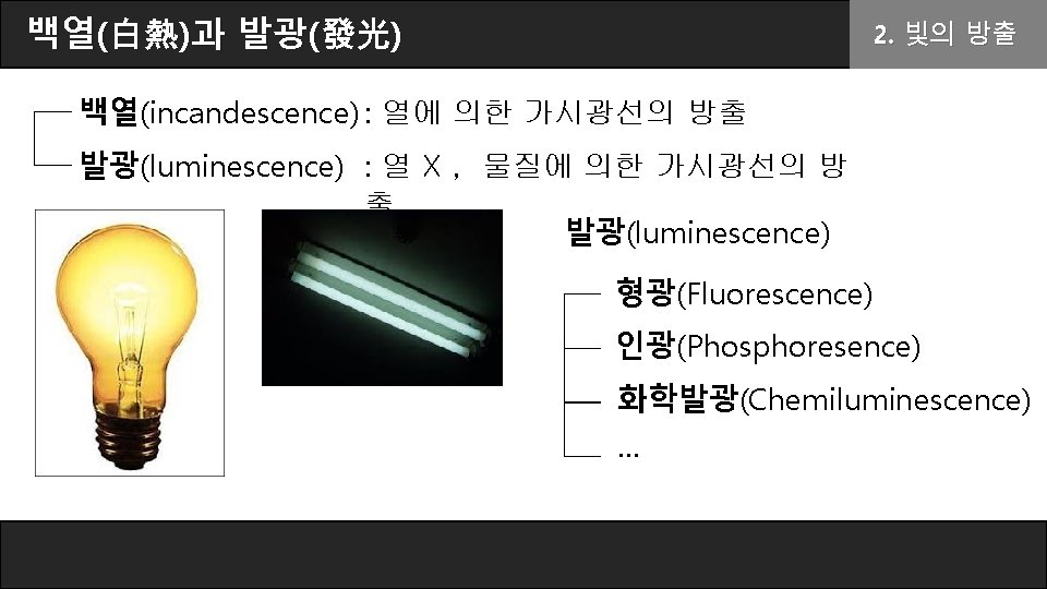 형광(螢光)과 인광(燐光) 형광(Fluorescence) 2. 빛의 방출 인광(Phosphoresence) “Photoluminescence“