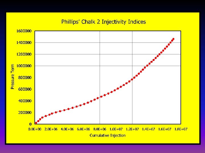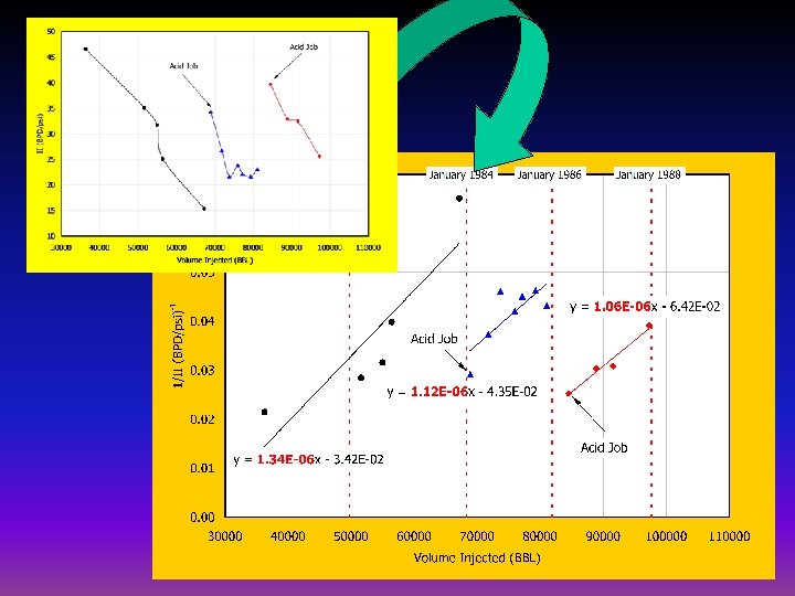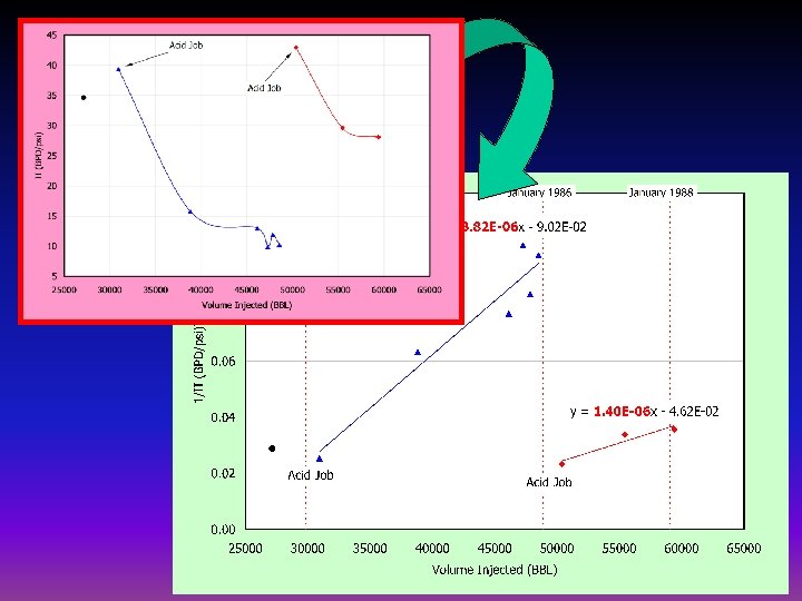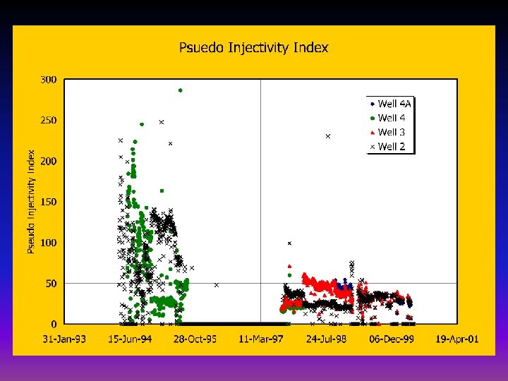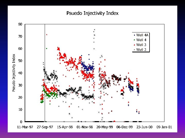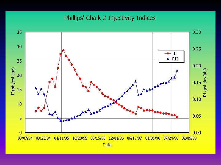 Saudi Aramco çTwo injectors, monitored over seven years ç 1/IIT plotted versus VT. çFor both wells the slopes decrease with time. çInjection water quality generally was improving through better corrosion and bacteria control. ç“On the assumption that GII 0 did not change, the improvement in water quality (i. e. , increasing RWQ) would account for the slope decrease. The improvement in water quality is not evident in the plots of injectivity index versus volume injected. ”