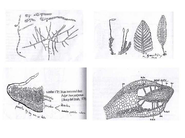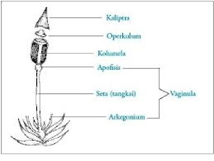 Bangsa Eubryales/ Bryales • • • Protonema berkembang baik. Perkembangan sporofit paling sempurna dan maju sehingga dijadikan dasar klasifikasi tingkat family, genus, dan spesies. Susunanan anatomi daun mendukung adaptasi kekeringan. Sel-sel lapisan atas mendukung lapisan banyak klorofil. Di dalam ruang-ruangan antar sel tersebut disimpan air. Sporogonium bertangkai elastis, di ujungnya terdapat kapsul spora berkaliptra yang dapat berkembang menjadi rambut-rambut. Bagian atas dinding kapsul spora merupakan tutup yang disebut operculum. Di bawah tepi operculum itu terdapat suatu struktur berbentuk lingkaran sempat dinamakan annulus (cincin), sel-selnya mengandung lender dan mengembang sehingga menyebabkan operculum dapat membuka. Pada bagian bawah operculum, terdapat suatu organ berupa gigi-gigi yang menutupi lubang kapsul spora disebut peristom. Gigi-gigi peristom dapat mengadakan gerakan higroskopik keluar dan kedalam, sehingga spora dapat membuka dan menutup kapsul spora, bergantung pada kelembapan udara. Jika udara kering, gigi-gigi peristom mengarah keluar sehingga spora dapat keluar dari kapsul spora.