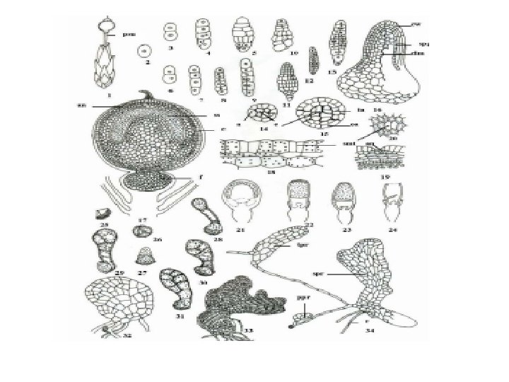 Bangsa Sphagnales • • • Anteredium terletak di ketiak sedangkan arkegonium terletak di ujung Protonema berbentuk daun kecil dengan tepi daun yang bertoreh, Terdiri atas satu lapis sel, menempel pada alas dengan rhizoid. Tiap protonema hanya akan membentuk satu gametofor. Gametofor terdiri atas batang-batang bercabang dengan daun-daun. Tidak ada rusuk tengah pada daun. Gametofor tidak mempunyai rhizoid. Daun tersusun atas sel-sel yang berkloroplas dan sel-sel yang mati dan kosong. Batang bercabang-cabang tegak dan membentuk roset diujung. Jaringan pada batang seperti spons parenkim, sama dengan mesofil daun. Gametangium terdapat pada cabang-cabang yang khusus. Cabang yang mendukung anteridium pada ketiak daun, sedang ccabang yang mendukung arkegonium pada ujung cabang. Seta hanya merupakan lekukan antara kaki dan kapsul. Kapsul spora mempunyai tutup tetapi tidak terdapat peristom. Kolumela berbentuk setengah bola.