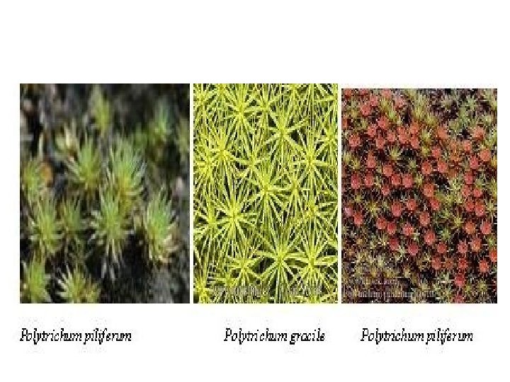 Nematodontae • Gigi peristom terdiri dari sel yang utuh, tidak bergaris-garis. • Umumnya termasuk lumut yang umurnya lebih darisetahun. • Contohnya : suku. Polytrichaceae, yaitu. Polytrichum commune, Pogonatumcirrhatum, Georgiapellucida. • Daun-daun sempit, pada sisi perut tulang daun seringkali terdapat lamelia yang membujur. • Kapsul spora tegak dan mendatar, peristom terdiri dari 32 -64 gigi.
