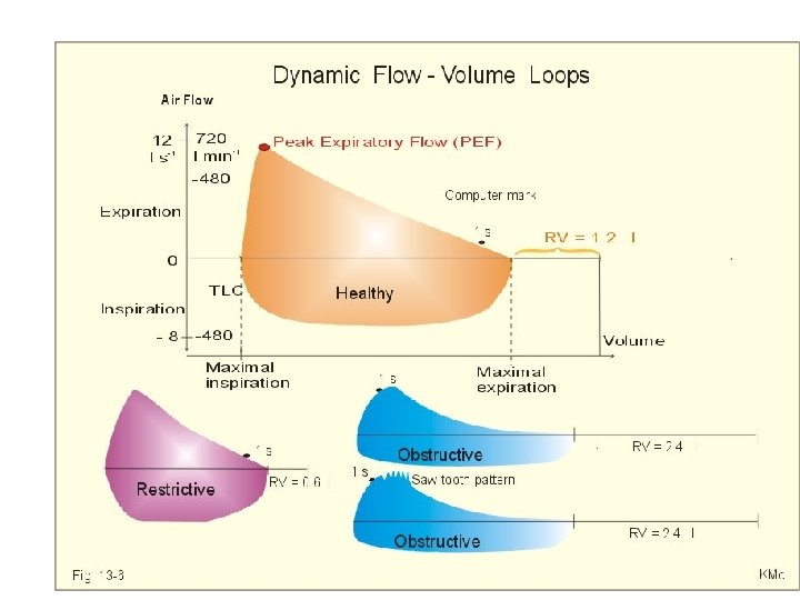 COPD 1. Emphysema 2. Chronic bronchitis ± 3. Bronchial asthma…only when it becomes chronic 1. Compliance: mainly in emphysema, due to destruction of the elastic fibers, 2. FRC: 3. . Airway R. more fluctuation during dynamic phases mainly in asthma. Smoking inhibits cilia accumulation of mucus bacterial growth chronic bronchitis. Smoking induces hyperplasia of Goblet cells excessive mucus secretion bacterial growth chronic bronchitis Chronic bronchitis…. excessive mucous production Asthma…. bronchiole constriction