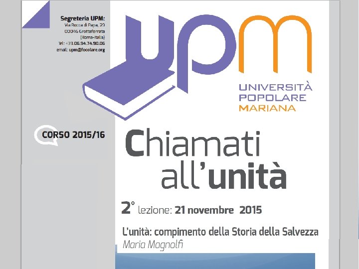 L’Unità: compimento della Storia della salvezza A) andando in profondità alle radici della persona per condurla poi a: B) spalancare i suoi occhi – ambito dopo ambito, cerchio dopo cerchio – per sapersi muovere e interagire con i suoi simili e col tutto il creato secondo il modello della Trinità, cioè della sua figliolanza col Padre nello Spirito Santo. Persona “in relazione”, comunionale - germe e lievito di unità all’interno di quell’umanità “UNA nella sua complessità”, vista così e così voluta dal Creatore, come già emerge in Genesi.