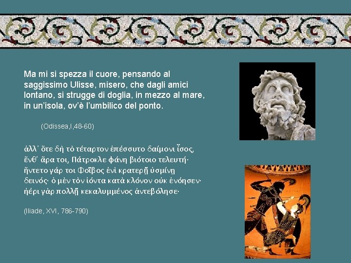 LA VICINANZA MORALE Le divinità condividono con gli uomini anche le passioni, positive e negative. Esse ricorrono ad ogni mezzo per raggiungere i loro obiettivi, non solo a danno degli uomini ma anche dei loro simili. E meditando inganni le disse Era divina: « Dammi dunque, l’amore, l’incanto, con cui tutti vinci gli eterni e gli uomini mortali. Vado a vedere i confini della terra feconda, l’Oceano e Teti, che nelle loro case mi nutrirono e crebbero. Questi vado a vedere, scioglierò loro litigio infinito. (Il. , XIV, 197 -205)