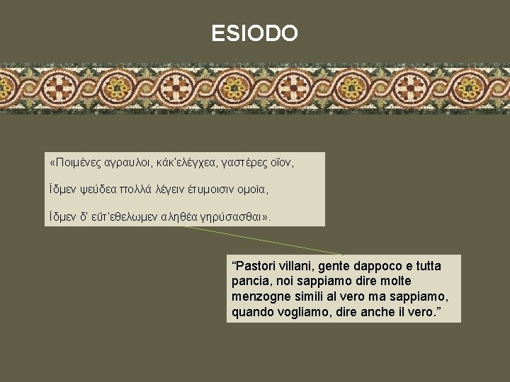 ESIODO Con Esiodo la cultura greca conosce la prima riflessione individuale sull’universo e sull’esistenza degli uomini. Il destino degli uomini, gli dei, la giustizia e il rifiuto della mentalità aristocratica sono i principali temi che ne attraversano le opere. Nel proemio della Teogonia le Muse ammettono di saper dire “menzogne simili al vero”, ma conferiscono a Esiodo il privilegio di esprimere la verità, che è l’unica.