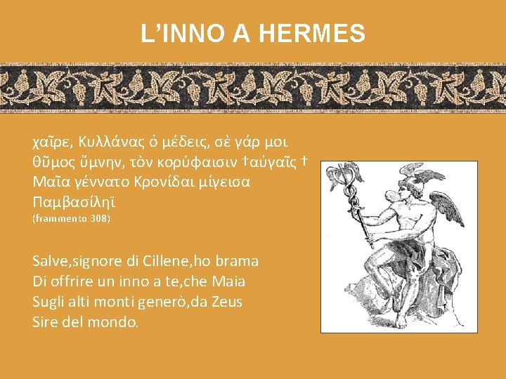 LA SFERA DEL DIVINO Alceo visse durante un momento di ‘’rivoluzione’’: a Lesbo, infatti, elementi della religione olimpica coesistevano con forme di cultura più arcaiche, di cui il poeta era partecipe, e con lui la sui eteria. Infatti le figure divine che rappresenta sembrano a prima vista dotate dei loro caratteri naturali, ma hanno anche prerogative legate all’ambiente di Lesbo. Alceo dedicò diversi inni agli dei, i più importanti sono quelli a: Apollo, Hermes, Ninfe. Quelli di Alceo sono inni monodoci, ciò vuol dire che: • Erano destinati a un pubblico ristretto, in questo caso l’eteria • Il dio invocato è argomento centrale del componimento • Sono di lunghezza moderata