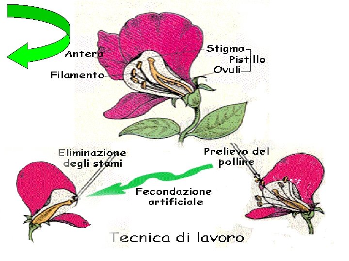 Occorre permettere che, al tempo di Mendel, non si sapeva ancora nulla né di ragionamenti dello studioso si basavano esclusivamente sulle sue osservazioni dirette e su esperimenti molto semplici che egli aveva compiuto sulle piante di pisello che coltivava nell’orto del convento. Le piante di pisello hanno una riproduzione sessuale e sono ermafrodite: nello stesso fiore sono contenuti sia l’organo riproduttore maschile, lo stame, che produce il polline da cui derivano i gameti maschili, sia l’organo riproduttore femminile, il pistillo, che, nella sua parte inferiore, l’ovario, contiene gli ovuli, dai quali derivano i gameti femminili. Quando i gameti maschili penetrano nell’ovario e fecondano gli ovuli dello stesso fiore, si ha l’autoimpollinazione; quando, invece, l’impollinazione avviene fra stami e pistilli di fiori diversi un’impollinazione incrociata. Normalmente nei fiori di pisello avviene l’autoimpollinazione, ma Mendel per poter compiere i suoi esperimenti, dovette ricorrere a un’. Egli cioè asportava con un pennellino un po’ di polline dagli stami di un fiore e lo spargeva sul pistillo del fiore di un’altra pianta giunta a maturazione alla quale però aveva asportato gli stami prima che maturassero a loro volta, per evitare l’autoimpollinazione.