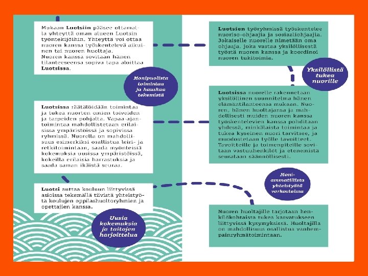 Yksilöllistä tukea nuorille • Luotsi on tarkoitettu helsinkiläisille yläkouluikäisille nuorille, joiden elämäntilanteeseen tarvitaan tukea, mutta tarvetta lastensuojelulliseen tai hoidolliseen työhön ei ole. • Luotsi-toiminta painottuu nuorten vapaa-aikaan, eli iltoihin ja viikonloppuihin. • Luotsi-toimintaan osallistuminen on vapaaehtoista. • Luotsi-toiminnasta vastaa yhteistyössä Helsingin nuorisopalvelut ja sosiaali- ja terveyspalvelut