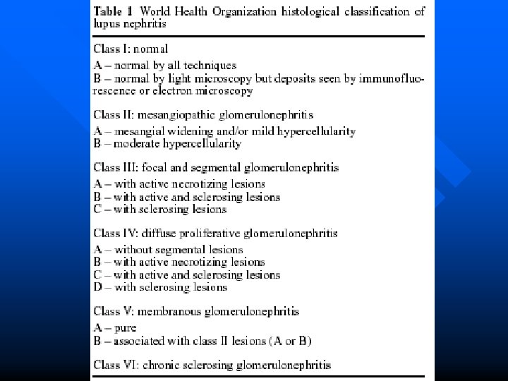 Lupus Nephritis in Children Renal involvement in SLE: 30% - 70% n Most diagnosis in adolescence, rare < 5 y/o n Classification of lupus nephritis: WHO classification : Table 1 n S/S: microscopic hematuria; proteinuria : mild to nephrotic range; hypertension; renal insufficiency n
