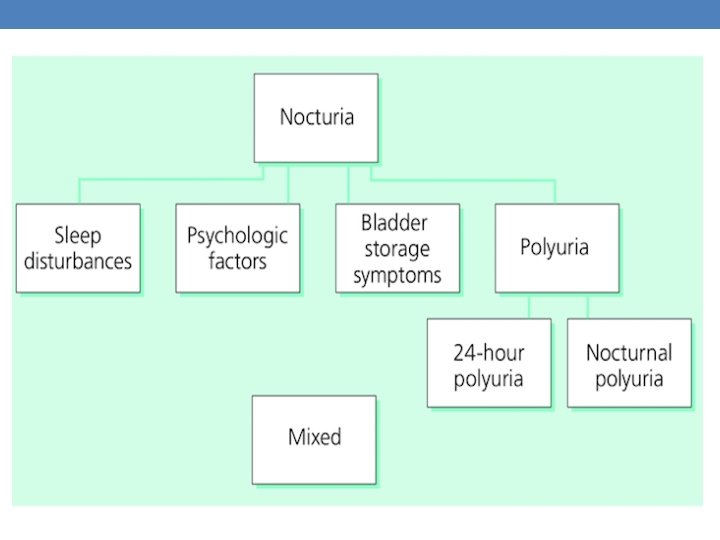 Bladder Diary Nocturia Voiding Diary Nocturnal polyuria Low nocturnal bladder capacity NUV / Total >35% Mixed eg BPH; infection; Ca. B ? ? aetiology Polyuria 24 hr UO >40 mg/kg