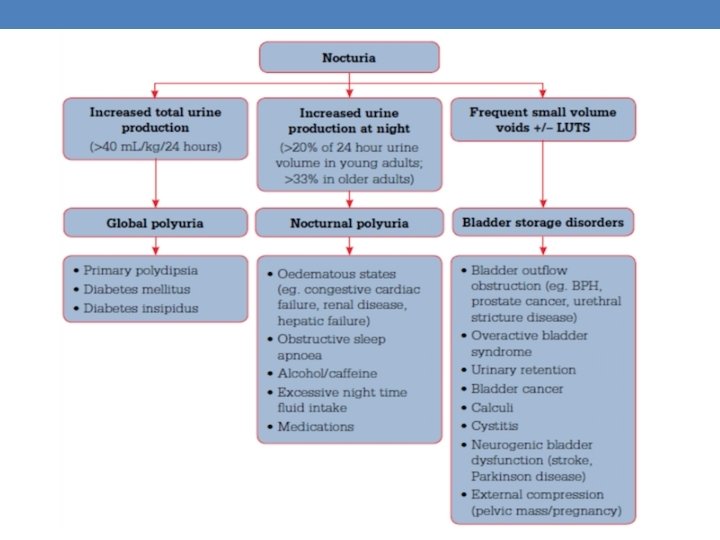 Nocturia • Prevalence • 20 -40 yrs: • > 70 yrs: 2 -20% 28 -60% • Quality of Life Issues: • increased no. of falls • increased no. of fractures • mood disturbances • increased daytime fatigue • decreased alertness • nocturnal polyuria contributory factor in ≈83% of people with nocturia