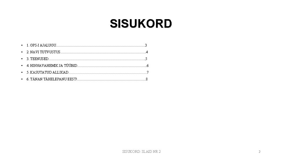KASUTATUD ALLIKAD • http: //et. wikipedia. org/wiki/GPS • http: //www. naviseade. ee/ee/auxpage_navigation/ • http: //www. naviseade. ee/ee/auxpage_services • http: //blog. garmingps. ee/kat/kampaania • http: //swotti. starmedia. com/gps/tomtom-go-910_15364. htm • http: //www. naviseade. ee/ KASUTATUD ALLIKAD: SLAID NR 8 7