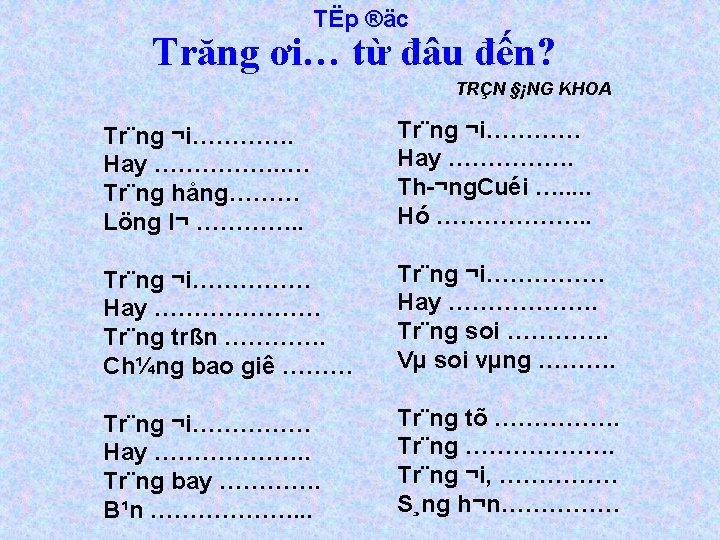 TËp ®äc Trăng ơi… từ đâu đến? TRÇN §¡NG KHOA Tr¨ng ¬i…tõ ®©u ®Õn? Hay tõ c¸nh rõng xa Tr¨ng hång nh qu¶ chÝn Löng l¬ lªn tr ícnhµ. Tr¨ng ¬i…tõ ®©u ®Õn? Hay tõ lêi mÑ ru Th ¬ng. Cuéi kh «ng ® îc häc Hó gäi tr©u ®Õn giê! Tr¨ng ¬i…tõ ®©u ®Õn? Hay biÓn xanh diÖu k× Tr¨ng trßn nh m¾t c¸ Ch¼ng bao giê chíp mi. Tr¨ng ¬i…tõ ®©u ®Õn? Hay tõ ® êng hµnh qu©n Tr¨ng soi chó bé ®éi Vµ soi vµng gãc s©n. Tr¨ng ¬i…tõ ®©u ®Õn? Hay tõ mét s©n ch¬i Tr¨ng bay nh qu¶ bãng B¹n nµo ®¸ lªn trêi. Tr¨ng tõ ®©u…tõ ®©u? Tr¨ng ®i kh¾p mäi miÒn Tr¨ng ¬i, cã n¬i nµo S¸ng h¬n ®Êt n ícem…