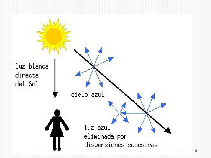 El cielo azul. • El color azul del cielo se debe a la dispersión Rayleigh. Cuando la luz del Sol atraviesa la atmósfera para llegar hasta nosotros, la mayor parte de la luz roja, anaranjada y amarilla (longitudes de onda largas) pasa sin ser casi afectada. Sin embargo, buena parte de la luz de longitudes de onda más cortas es dispersada por las moléculas gaseosas del aire. A cualquier parte del cielo que miremos, estaremos viendo algo de esa luz dispersada, que es azul, y por eso el cielo es de ese color. En cambio, la luz que nos llega directamente del Sol perdió parte de su color azul, por eso el Sol se ve amarillento. •