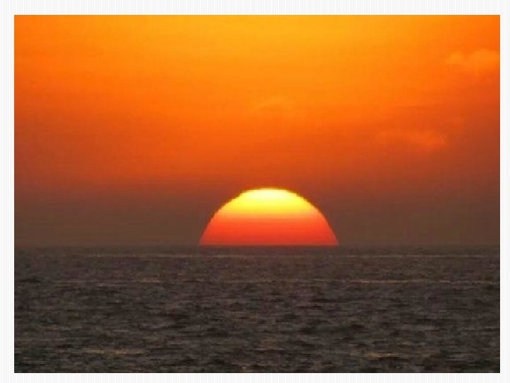 El horizonte. • Al mirar hacia un punto más cercano al horizonte, el cielo se ve de un color azul más pálido. • Esto se debe a que, para llegar hasta nosotros, la luz del cielo debe en este caso atravesar una mayor cantidad de aire, y por lo tanto (vuelve a ser dispersada) • La luz que nos llega del cielo cercano al horizonte habrá entonces perdido parte de su color azul y se verá pálida o blanquecina. •