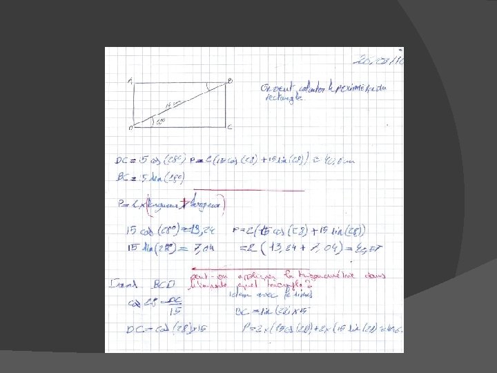 3ème type d’exercices: Exercice permettant d’évaluer la rédaction indépendamment du raisonnement On souhaite calculer au mm près le périmètre du rectangle suivant: Aide Lucas à rédiger rigoureusement sa réponse: 15 cos(28) 15 sin(28) 2(15 cos(28) + 15 sin(28)) donc 40, 6 cm