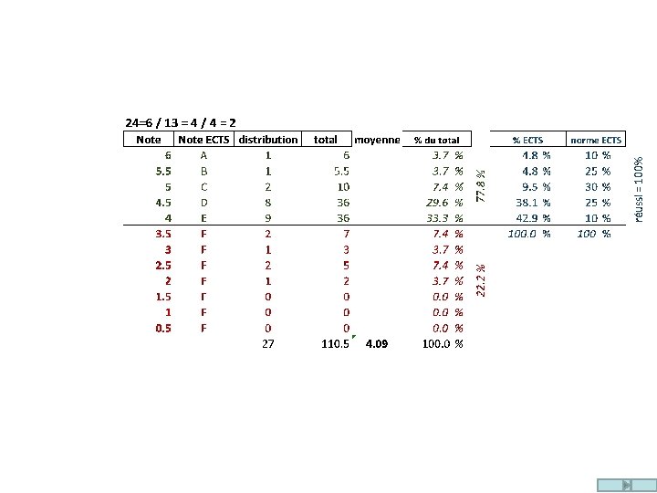 Combien ? Exemple Si évaluation critérielle: 47 à 49 points : A 45 à 46 points : B 41 à 44 points : C 37 à 40 points : D 34 à 36 points : E O à 33 points : F Si évaluation normative ECTS (European Credits Transfer System) : Les grades sont attribués aux étudiants ayant réussi, selon l’échelle de réussite suivante: A les 10 % meilleurs; B les 25 % suivants; C les 30 % suivants; D les 25 % suivants; E les 10 % restants. F = échec