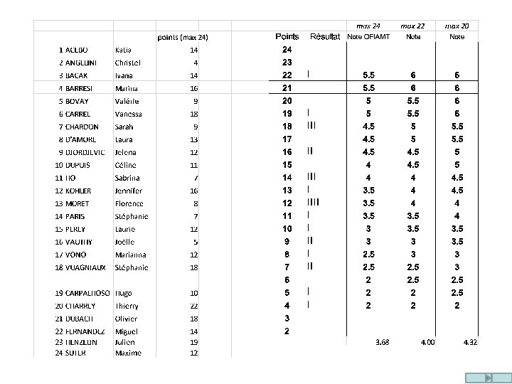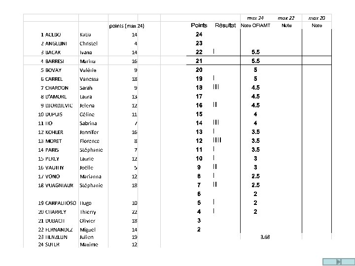 Points 25 24 23 22 21 20 19 18 17 16 15 14 13 12 11 10 9 8 7 6 5 4 3 2 1 0 Résultat Note 6 6 5. 5 5 5 5 4 4 4 3. 5 3 3 3 2. 5 2 2 2 1. 5 1 1 I I III I IIII II II I I
