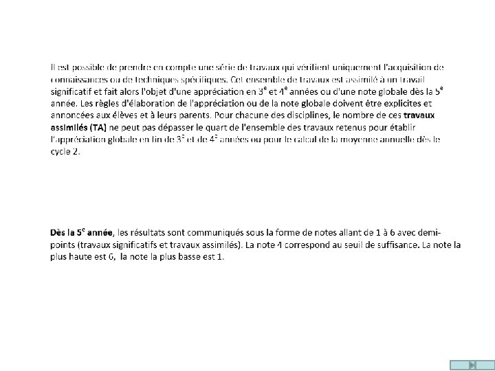 Dès la 3 e année, les enseignants évaluent régulièrement et tout au long de l'année le degré d'atteinte des objectifs par leurs élèves, au moyen de travaux significatifs (TS). Ces travaux constituent éléments essentiels de l’évaluation sommative. Le nombre de travaux significatifs d’une discipline par semestre et pas année scolaire doit être compris dans les limites suivantes.