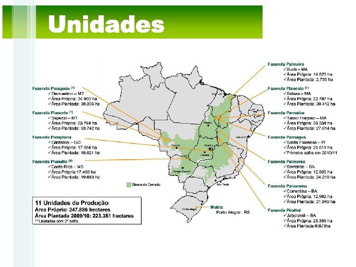 Fornecedores Fertilizantes (NPK) ü ü ü ADM Bunge Fertizantes Heringer Roullier Yara Fertipar Químicos ü ü ü ü Monsanto Syngenta Du Pont BASF Bayer Dow FMC Clientes Grãos ü ü ü ü ADM Bunge Cargill Louis Dreyfus Corn Produts Amaggi ABC Algodão ü ü ü Vicunha Dunavant Enterprises Cargill Cotton Louis Dreyfus Coteminas Olam/Queensland 4